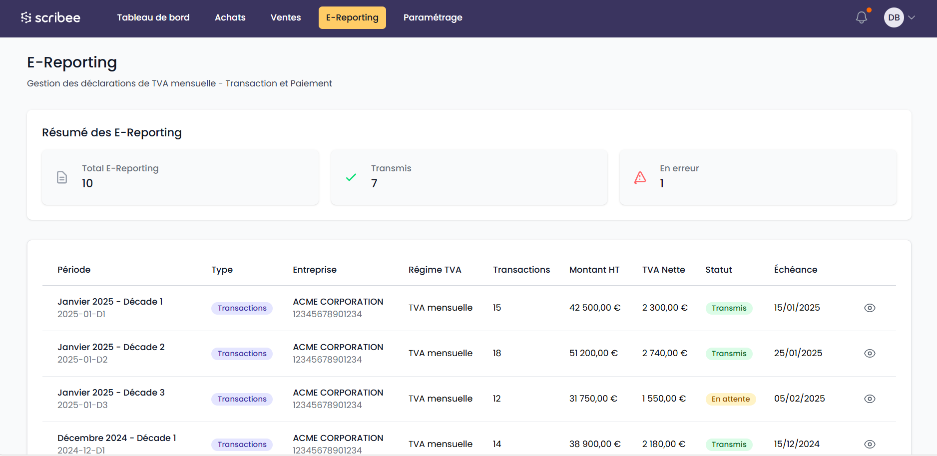 - Votre e-reporting réalisé et transmis à l’administration fiscale